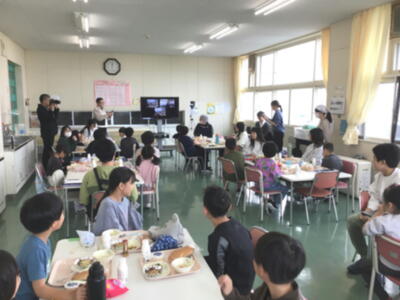 今日は、石川県内灘町(うちなだちょう)向粟崎(むかいあわがさき)小学校とテレビで映像を結んで、お互いの給食の様子を交流し合う「コラボ給食」を行いました。