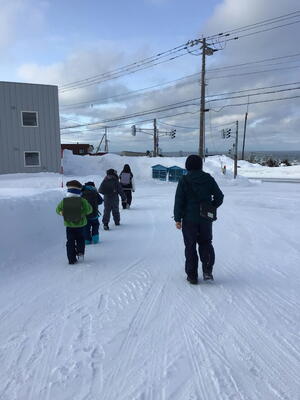 この活動は、①冬の通学路における危険箇所の把握と確認、そして安全な歩き方を学ぶこと。②登下校中に起こりやすい危険な行動について確認すること。③悪天候その他の事象等で集団下校となる際の歩行訓練。を目的としています。